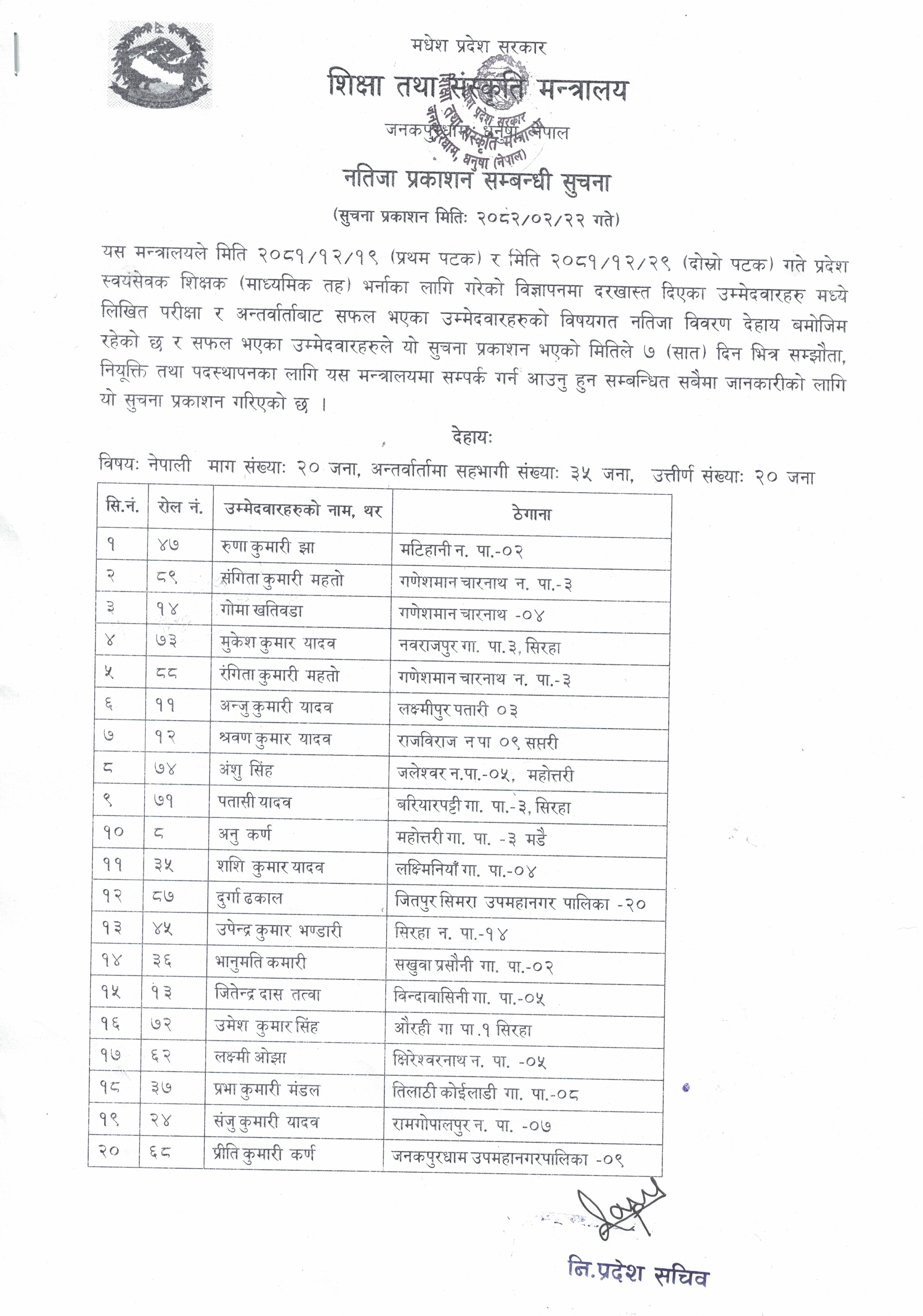 प्रदेश स्वयंसेवक शिक्षकको लिखित परीक्षाको नतिजा प्रकाशन तथा अन्तर्वार्ता सञ्चालन सम्बन्धी सूचना ।